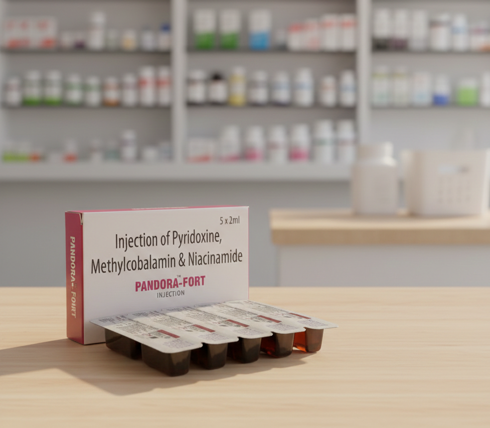 PANDORA-FORT is a neuroprotective and neuropromotive injection. Each 2 ml dose contains Methylcobalamin (1500 mcg), Pyridoxine Hydrochloride (100 mg), and Nicotinamide (100 mg).